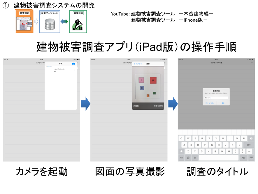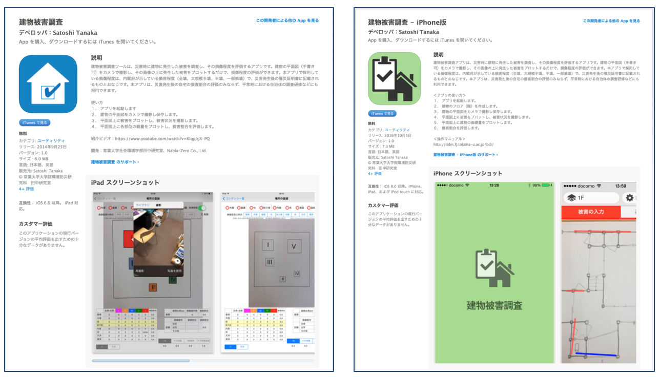 開発したアプリは、AppStoreで公開しています。iTunesで「建物被害調査」と検索すれば無料でダウンロードできます。またそれぞれの使用方法については、YouTubeにアップされており、「建物被害調査ツール」と検索すれば、具体的な方法の説明があります。