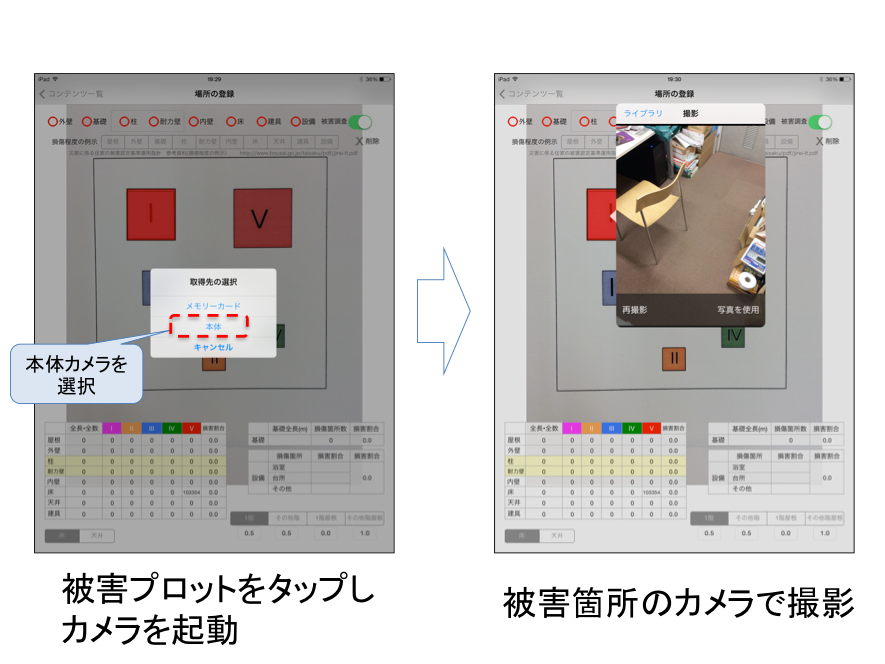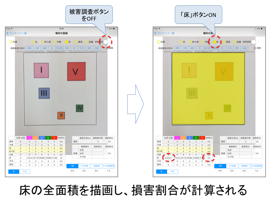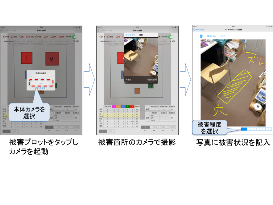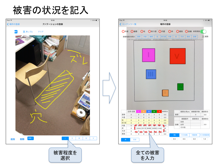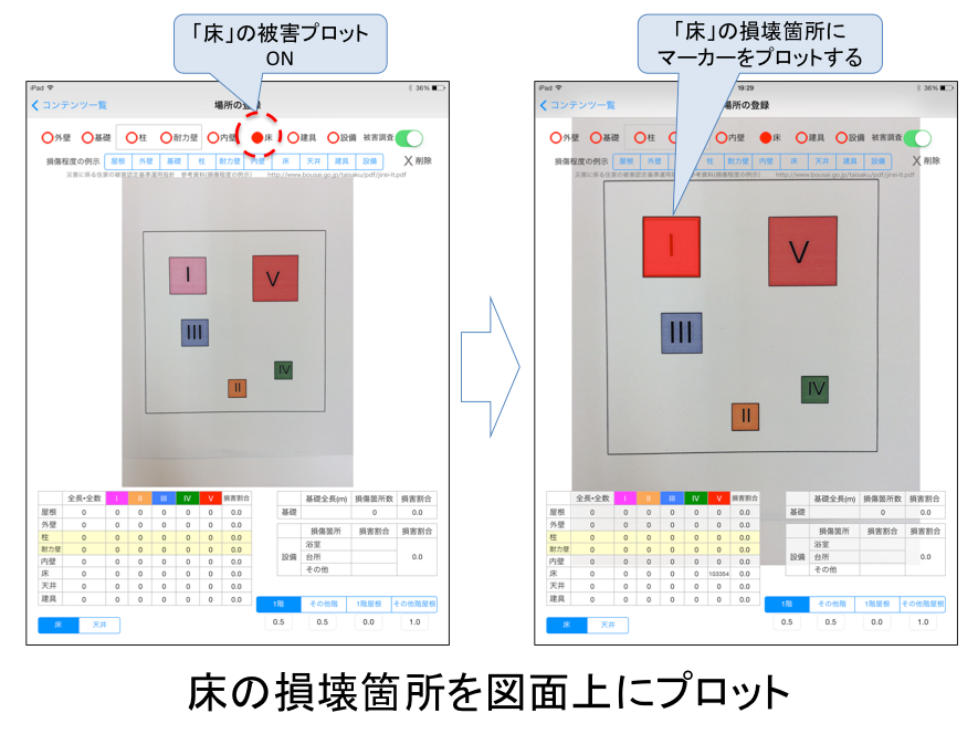 建物被害調査アプリでは、紙の平面図を携帯情報端末のカメラで撮影し、撮影した平面図の写真上に、損傷箇所にマーカーをプロットするしくみです。さらに損傷箇所の写真を撮影し、このマーカーと紐付けることにより、被害図面と被害写真が統合されます。また被害をプロットしたマーカーは、端末上で面積や長さ、個数が自動的に計算されるため、それぞれの部位の基礎量を入力すれば、損害割合が算出されます。さらに余震などで建物の損傷状況が変化した場合でも、状態が変化した部分のみを追加・更新すれば、全体の損害割合が自動的に更新されます。