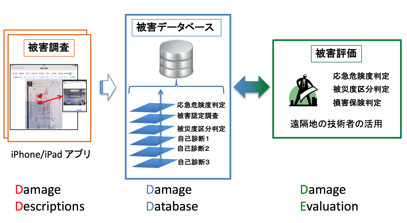 携帯情報端末(iPhone/iPad)を活用した建物被害調査システムを開発しました。このシステムは、携帯情報端末(iPhone/iPad)の建物被害調査アプリと建物被害データベースで構成されます。