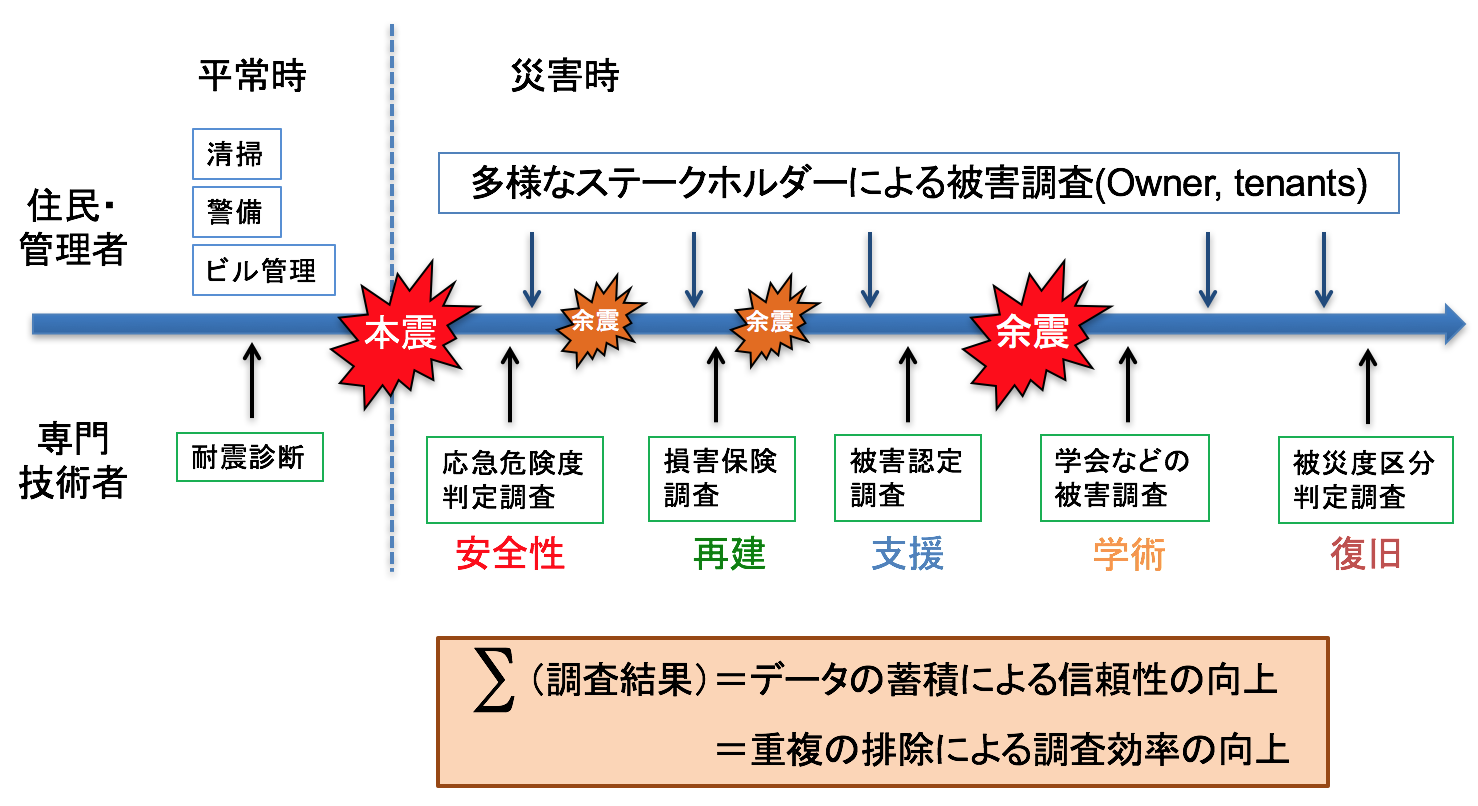 災害が発生すると多くの機関で建物の被害調査が実施されますが、それぞれ目的が異なるため、一つの被災建物に対して同じような調査が何度も繰り返されることになっています。災害時には建物の状態を判断できる専門家は少ないため、調査情報を共有することによって、より効率的に調査や評価を実施する必要があります。
