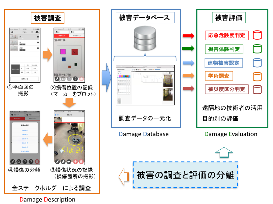 さらにさまざまな被害調査の方法は、それぞれの調査目的に最適化されているため、調査結果を相互利用することができません。そこで、従来の建物被害調査における被害の調査作業と評価作業を分離し、調査結果の相互利用が可能なしくみの構築を目指しています。ここで被害の調査とは、建物に発生した損傷の場所と状況を記録する作業であり、被害の評価とは、調査から得られた損傷情報から建物の状態を評価する作業と定義します。